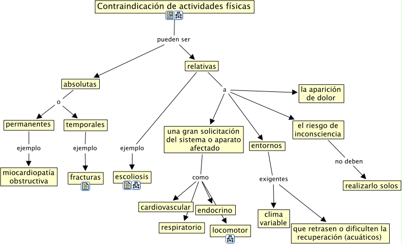 Actividad fisica. Contraindicacion, relativas a una gran solicitación del sistema o aparato afectado, una gran solicitación del sistema o aparato afectado como cardiovascular, relativas ejemplo escoliosis, entornos exigentes que retrasen o dificulten la recuperación (acuáticos), Contraindicación de actividades físicas pueden ser relativas, entornos exigentes clima variable, relativas a el riesgo de inconsciencia, relativas a entornos, absolutas o permanentes, permanentes ejemplo miocardiopatía obstructiva