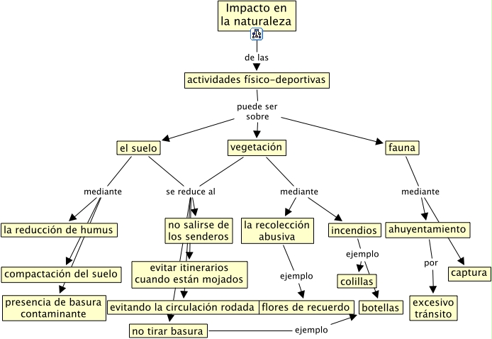 Impacto en la Naturaleza, vegetación mediante incendios, Impacto en la naturaleza de las actividades físico-deportivas, el suelo se reduce al no tirar basura, el suelo se reduce al no salirse de los senderos, el suelo mediante presencia de basura contaminante, actividades físico-deportivas puede ser sobre vegetación, fauna mediante captura, vegetación se reduce al evitando la circulación rodada, vegetación se reduce al evitar itinerarios cuando están mojados, actividades físico-deportivas puede ser sobre el suelo