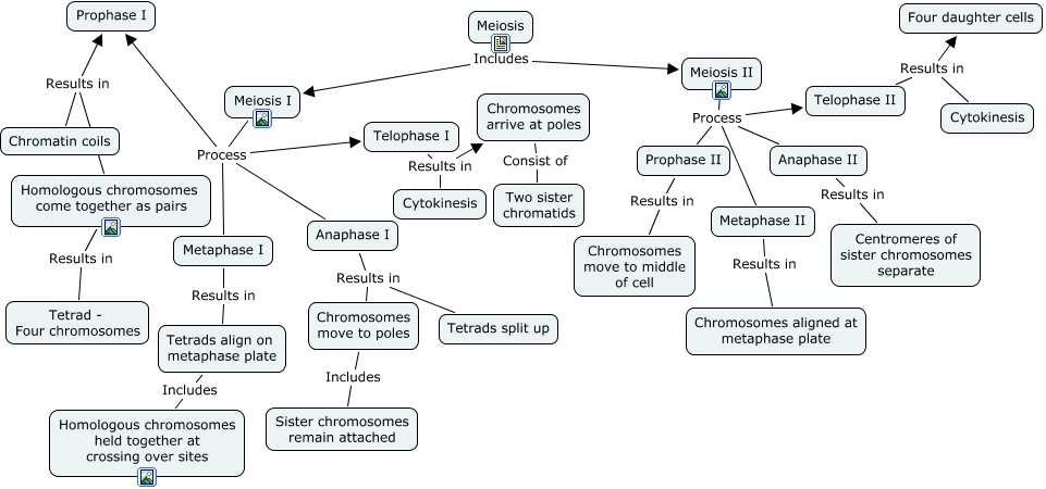 This Concept Map, created with IHMC CmapTools, has information related to: Meiosis, Meiosis II Process Prophase II, Telophase II Results in Four daughter cells, Meiosis II Process Anaphase II, Chromatin coils Results in Prophase I, Metaphase II Results in Chromosomes aligned at metaphase plate, Meiosis Includes Meiosis I, Anaphase II Results in Centromeres of sister chromosomes separate, Metaphase I Results in Tetrads align on metaphase plate, Meiosis I Process Metaphase I, Chromosomes move to poles Includes Sister chromosomes remain attached, Meiosis I Process Prophase I, Meiosis II Process Telophase II, Meiosis I Process Telophase I, Anaphase I Results in Chromosomes move to poles, Telophase II Results in Cytokinesis, Telophase I Results in Cytokinesis, Meiosis I Process Anaphase I, Meiosis II Process Metaphase II, Prophase II Results in Chromosomes move to middle of cell, Chromatin coils Results in Homologous chromosomes come together as pairs
