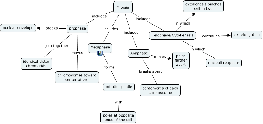 This Concept Map, created with IHMC CmapTools, has information related to: Mitosis EH, Mitosis includes Telophase/Cytokenesis, Telophase/Cytokenesis continues cell elongation, Mitosis includes Metaphase, mitotic spindle with poles at opposite ends of the cell, Mitosis includes prophase, Metaphase forms mitotic spindle, Anaphase moves poles farther apart, prophase breaks nuclear envelope, prophase moves chromosomes toward center of cell, Telophase/Cytokenesis in which nucleoli reappear, Mitosis includes Anaphase, prophase join together identical sister chromatids, Anaphase breaks apart centomeres of each chromosome, Telophase/Cytokenesis in which cytokenesis pinches cell in two