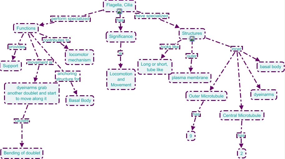 This Concept Map, created with IHMC CmapTools, has information related to: flagellagreen good, Outer Microtubule has 9, Significance is Locomotion and Movement, Structures inner dyeinarms, Functions anchoring structure for Basal Body, Structures inner Central Microtubule, Functions provides Support, Structures inner basal body, Structures inner Outer Microtubule, Structures looks like Long or short, tube like, Flagella, Cilia perform specialized Functions, Flagella, Cilia has Significance, Structures outer plasma membrane, dyeinarms grab another doublet and start to move along it causes Bending of doublet, Flagella, Cilia have specialized Structures, Functions movement is dyeinarms grab another doublet and start to move along it, Functions contributes to locomotor mechanism, Central Microtubule has 2