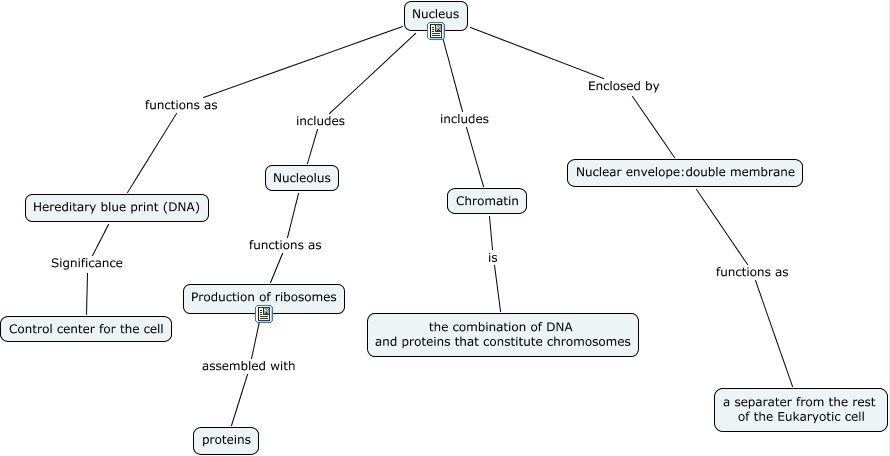 This Concept Map, created with IHMC CmapTools, has information related to: Nucleus blue, Nucleus functions as Hereditary blue print (DNA), Production of ribosomes assembled with proteins, Nucleus includes Nucleolus, Nuclear envelope:double membrane functions as a separater from the rest of the Eukaryotic cell, Nucleus includes Chromatin, Hereditary blue print (DNA) Significance Control center for the cell, Nucleus Enclosed by Nuclear envelope:double membrane, Nucleolus functions as Production of ribosomes, Chromatin is the combination of DNA and proteins that constitute chromosomes