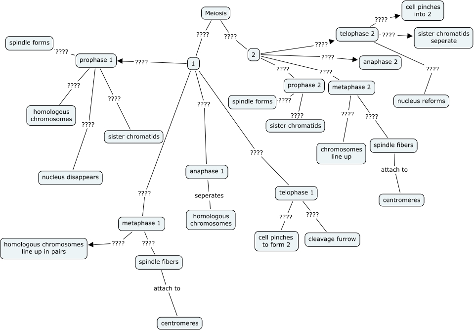 This Concept Map, created with IHMC CmapTools, has information related to: Meiosis, Meiosis ???? 1, 2 ???? telophase 2, prophase 2 ???? spindle forms, 2 ???? prophase 2, prophase 1 ???? homologous chromosomes, metaphase 2 ???? chromosomes line up, 2 ???? metaphase 2, 1 ???? metaphase 1, metaphase 2 ???? spindle fibers, telophase 1 ???? cell pinches to form 2, spindle fibers attach to centromeres, prophase 1 ???? spindle forms, 1 ???? anaphase 1, telophase 2 ???? sister chromatids seperate, 1 ???? prophase 1, prophase 1 ???? sister chromatids, telophase 1 ???? cleavage furrow, prophase 2 ???? sister chromatids, Meiosis ???? 2, metaphase 1 ???? spindle fibers