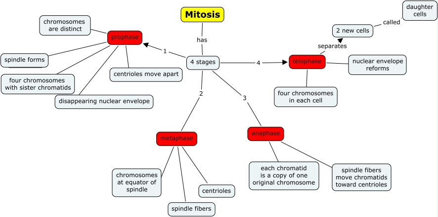 This Concept Map, created with IHMC CmapTools, has information related to: Mitosis ZD, 4 stages 3 anaphase, 4 stages 4 telophase, prophase ???? centrioles move apart, prophase four chromosomes with sister chromatids, metaphase ???? chromosomes at equator of spindle, 4 stages 2 metaphase, anaphase ???? each chromatid is a copy of one original chromosome, telophase ???? nuclear envelope reforms, prophase chromosomes are distinct, 2 new cells called daughter cells, telophase separates 2 new cells, telophase ???? four chromosomes in each cell, prophase disappearing nuclear envelope, 4 stages 1 prophase, anaphase ???? spindle fibers move chromatids toward centrioles, prophase spindle forms, metaphase ???? spindle fibers, metaphase ???? centrioles, Mitosis has 4 stages