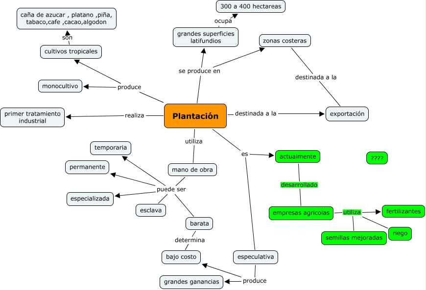 Este mapa conceptual tiene información relacionada a: Plantación, Plantación es actualmente, grandes superficies latifundios ocupa 300 a 400 hectareas, mano de obra puede ser esclava, cultivos tropicales son caña de azucar , platano ,piña, tabaco,cafe ,cacao,algodon, mano de obra puede ser permanente, Plantación se produce en grandes superficies latifundios, Plantación realiza primer tratamiento industrial, empresas agricolas utiliza semillas mejoradas, especulativa produce bajo costo, zonas costeras destinada a la exportación