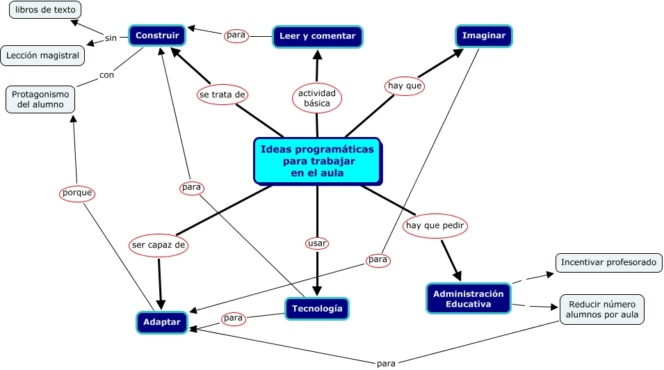 This Concept Map, created with IHMC CmapTools, has information related to: Programa para el aula, Administración Educativa Incentivar profesorado, Leer y comentar para Construir, Ideas programáticas para trabajar en el aula ser capaz de Adaptar, Ideas programáticas para trabajar en el aula usar Tecnología, Administración Educativa Reducir número alumnos por aula, Tecnología para Adaptar, Ideas programáticas para trabajar en el aula se trata de Construir, Ideas programáticas para trabajar en el aula actividad básica Leer y comentar, Imaginar para Adaptar, Construir sin libros de texto, Tecnología para Construir, Construir sin Lección magistral, Ideas programáticas para trabajar en el aula hay que Imaginar, Adaptar porque Protagonismo del alumno, Construir con Protagonismo del alumno, Ideas programáticas para trabajar en el aula hay que pedir Administración Educativa, Reducir número alumnos por aula para Adaptar