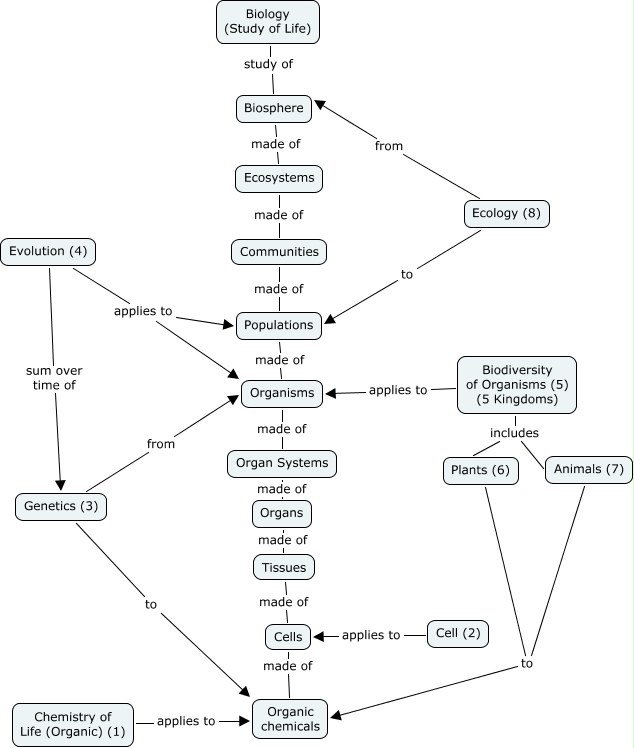 This Concept Map, created with IHMC CmapTools, has information related to: HS Biology Overview, Cell (2) applies to Cells, Tissues made of Cells, Organ Systems made of Organs, Biosphere made of Ecosystems, Evolution (4) applies to Organisms, Biodiversity of Organisms (5) (5 Kingdoms) includes Plants (6), Genetics (3) to Organic chemicals, Cells made of Organic chemicals, Organisms made of Organ Systems, Genetics (3) from Organisms, Biodiversity of Organisms (5) (5 Kingdoms) includes Animals (7), Ecosystems made of Communities, Chemistry of Life (Organic) (1) applies to Organic chemicals, Ecology (8) to Populations, Plants (6) to Organic chemicals, Organs made of Tissues, Evolution (4) sum over time of Genetics (3), Biology (Study of Life) study of Biosphere, Ecology (8) from Biosphere, Populations made of Organisms