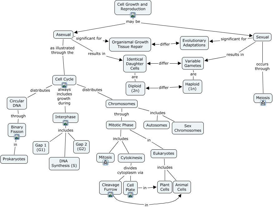 This Concept Map, created with IHMC CmapTools, has information related to: Cell Reproduction C8, Chromosomes includes Autosomes, Asexual results in Identical Daughter Cells, Sexual significant for Evolutionary Adaptations, Chromosomes includes Sex Chromosomes, Mitotic Phase in Eukaryotes, Cleavage Furrow in Animal Cells, Cell Plate in Plant Cells, Interphase includes Gap 2 (G2), Chromosomes through Mitotic Phase, Cell Growth and Reproduction may be Asexual, Binary Fission in Prokaryotes, Asexual as illustrated through the Cell Cycle, Mitotic Phase includes Mitosis, Mitotic Phase includes Cytokinesis, Interphase includes DNA Synthesis (S), Cell Cycle always includes growth during Interphase, Interphase includes Gap 1 (G1), Eukaryotes includes Plant Cells, Cell Growth and Reproduction may be Sexual, Cell Cycle distributes Chromosomes