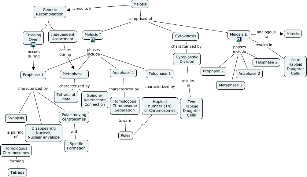 This Concept Map, created with IHMC CmapTools, has information related to: Meiosis, Telophase 1 characterized by Haploid number (1n) of Chromosomes, Metaphase 1 characterized by Spindle/ Kinetochore Connection, Haploid number (1n) of Chromosomes at Poles, Synapsis is pairing of Homologous Chromosomes, Prophase 1 characterized by Disappearing Nucleoli, Nuclear envelope, Prophase 1 characterized by Polar-moving centrosomes, Meiosis I phases include Telophase 1, Meiosis comprised of Meiosis I, Meiosis II results in Four Haploid Daughter Cells, Meiosis I phases include Prophase 1, Prophase 1 characterized by Synapsis, Meiosis results in Genetic Recombination, Meiosis II phases include Anaphase 2, Crossing Over occurs during Prophase 1, Meiosis I phases include Anaphase 1, Meiosis comprised of Cytokinesis, Independent Assortment occurs during Metaphase 1, Meiosis I phases include Metaphase 1, Meiosis II phases include Prophase 2, Metaphase 1 characterized by Tetrads at Plate