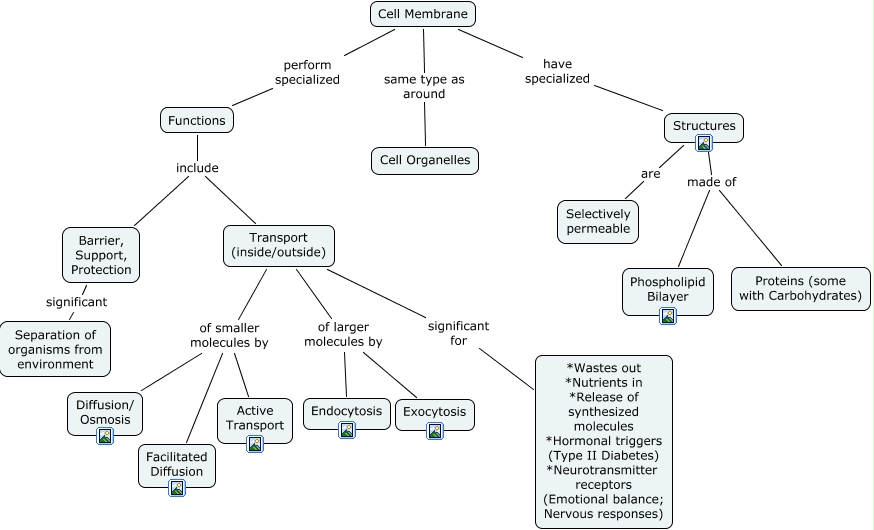 This Concept Map, created with IHMC CmapTools, has information related to: Cell Membrane, Transport (inside/outside) of smaller molecules by Diffusion/ Osmosis, Barrier, Support, Protection significant Separation of organisms from environment, Structures made of Phospholipid Bilayer, Functions include Barrier, Support, Protection, Transport (inside/outside) significant for *Wastes out *Nutrients in *Release of synthesized molecules *Hormonal triggers (Type II Diabetes) *Neurotransmitter receptors (Emotional balance; Nervous responses), Transport (inside/outside) of smaller molecules by Active Transport, Structures made of Proteins (some with Carbohydrates), Cell Membrane same type as around Cell Organelles, Functions include Transport (inside/outside), Transport (inside/outside) of smaller molecules by Facilitated Diffusion, Cell Membrane perform specialized Functions, Cell Membrane have specialized Structures, Structures are Selectively permeable, Transport (inside/outside) of larger molecules by Endocytosis, Transport (inside/outside) of larger molecules by Exocytosis