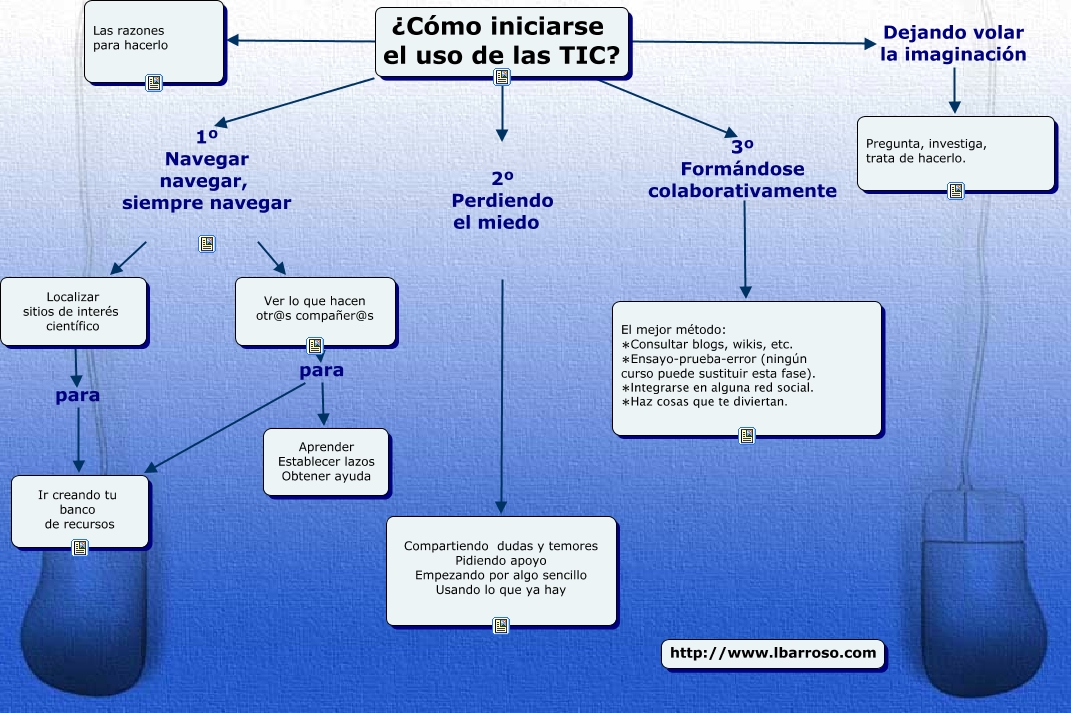 This Concept Map, created with IHMC CmapTools, has information related to: edumeme, ¿Cómo iniciarse el uso de las TIC? Dejando volar la imaginación Pregunta, investiga, trata de hacerlo., Ver lo que hacen otr@s compañer@s para Ir creando tu banco de recursos, Ver lo que hacen otr@s compañer@s para Aprender Establecer lazos Obtener ayuda, ¿Cómo iniciarse el uso de las TIC? 1º Navegar navegar, siempre navegar Ver lo que hacen otr@s compañer@s, ¿Cómo iniciarse el uso de las TIC? 1º Navegar navegar, siempre navegar Localizar sitios de interés científico, ¿Cómo iniciarse el uso de las TIC? 2º Perdiendo el miedo Compartiendo dudas y temores Pidiendo apoyo Empezando por algo sencillo Usando lo que ya hay, Localizar sitios de interés científico para Ir creando tu banco de recursos, ¿Cómo iniciarse el uso de las TIC? 3º Formándose colaborativamente El mejor método: ∗Consultar blogs, wikis, etc. ∗Ensayo-prueba-error (ningún curso puede sustituir esta fase). ∗Integrarse en alguna red social. ∗Haz cosas que te diviertan., ¿Cómo iniciarse el uso de las TIC? ???? Las razones para hacerlo