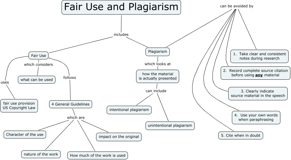 This Concept Map, created with IHMC CmapTools, has information related to: Fair use and plagiarism, 4 General Guidelines which are impact on the original, Fair Use uses fair use provision US Copyright Law, how the material is actually presented can include intentional plagiarism, 4 General Guidelines which are Character of the use, Plagiarism can be avoided by 4. Use your own words when paraphrasing, Plagiarism can be avoided by 2. Record complete source citation before using any material, Fair Use and Plagiarism includes Plagiarism, how the material is actually presented can include unintentional plagiarism, Fair Use which considers what can be used, Plagiarism can be avoided by 1. Take clear and consistent notes during research, Fair Use and Plagiarism includes Fair Use, 4 General Guidelines which are nature of the work, Fair Use follows 4 General Guidelines, Plagiarism can be avoided by 5. Cite when in doubt, Plagiarism can be avoided by 3. Clearly indicate source material in the speech, 4 General Guidelines which are How much of the work is used, Plagiarism which looks at how the material is actually presented