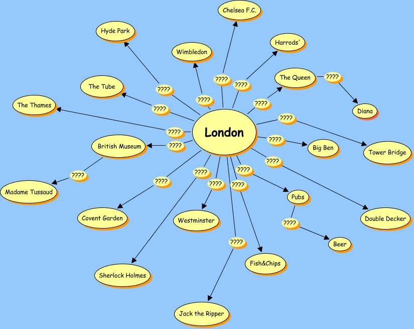 This Concept Map, created with IHMC CmapTools, has information related to: Brainstorming step1, London ???? British Museum, London ???? Hyde Park, London ???? Westminster, Pubs ???? Beer, London ???? The Thames, London ???? Chelsea F.C., London ???? Double Decker, London ???? Pubs, London ???? The Queen, British Museum ???? Madame Tussaud, London ???? The Tube, The Queen ???? Diana, London ???? Big Ben, London ???? Jack the Ripper, London ???? Fish&Chips, London ???? Sherlock Holmes, London ???? Harrods', London ???? Tower Bridge, London ???? Wimbledon, London ???? Covent Garden