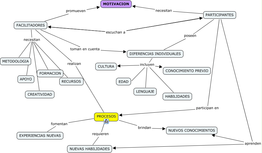 This Concept Map, created with IHMC CmapTools, has information related to: MOTIVACION, DIFERENCIAS INDIVIDUALES incluyen LENGUAJE, PARTICIPANTES aprenden NUEVAS HABILIDADES, FACILITADORES necesitan METODOLOGIA, DIFERENCIAS INDIVIDUALES incluyen HABILIDADES, FACILITADORES necesitan APOYO, PARTICIPANTES aprenden NUEVOS CONOCIMIENTOS, DIFERENCIAS INDIVIDUALES incluyen CONOCIMIENTO PREVIO, PROCESOS fomentan EXPERIENCIAS NUEVAS, FACILITADORES necesitan CREATIVIDAD, FACILITADORES escuchan a PARTICIPANTES, PROCESOS requieren NUEVAS HABILIDADES, PARTICIPANTES participan en PROCESOS, FACILITADORES necesitan RECURSOS, PARTICIPANTES poseen DIFERENCIAS INDIVIDUALES, FACILITADORES realizan PROCESOS, FACILITADORES promueven MOTIVACION, PARTICIPANTES escuchan a FACILITADORES, FACILITADORES necesitan FORMACION, PROCESOS brindan NUEVOS CONOCIMIENTOS, PARTICIPANTES necesitan MOTIVACION