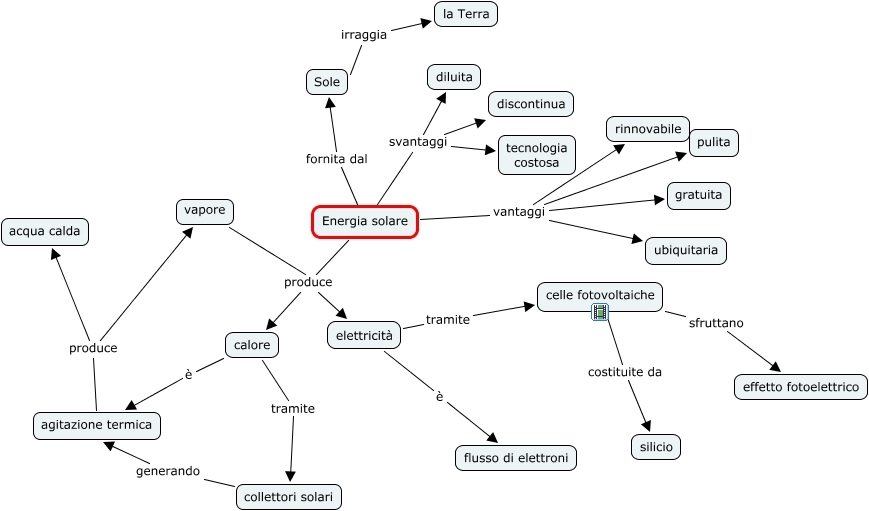 This Concept Map, created with IHMC CmapTools, has information related to: Energia solare, agitazione termica produce acqua calda, elettricità tramite celle fotovoltaiche, vapore produce elettricità, calore tramite collettori solari, collettori solari generando agitazione termica, celle fotovoltaiche costituite da silicio, Energia solare vantaggi rinnovabile, Energia solare produce calore, calore è agitazione termica, Energia solare fornita dal Sole, Energia solare svantaggi discontinua, Energia solare vantaggi ubiquitaria, agitazione termica produce vapore, Energia solare svantaggi tecnologia costosa, Energia solare svantaggi diluita, Sole irraggia la Terra, celle fotovoltaiche sfruttano effetto fotoelettrico, vapore produce calore, Energia solare produce elettricità, Energia solare vantaggi gratuita
