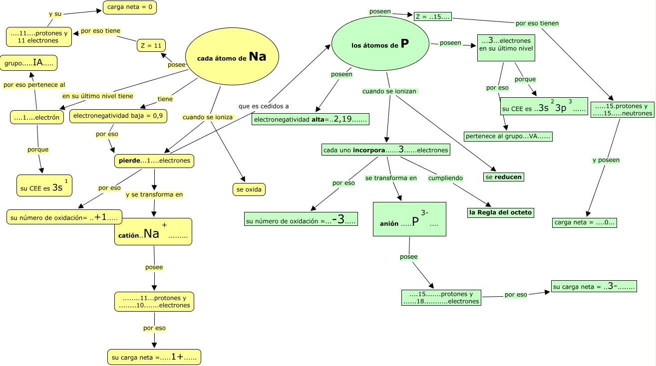 This Concept Map, created with IHMC CmapTools, has information related to: Ionización del Sodio y del Fósforo (Evaluación), cada átomo de Na cuando se ioniza se oxida, ....11....protones y 11 electrones y su carga neta = 0, cada átomo de Na tiene electronegatividad baja = 0,9, <math xmlns="http://www.w3.org/1998/Math/MathML"> <mrow> <mtext> anión .....P </mtext> <mmultiscripts> <mtext> </mtext> <none/> <mtext> 3- </mtext> </mmultiscripts> <mtext> .... </mtext> </mrow> </math> posee ....15.......protones y ......18...........electrones, electronegatividad baja = 0,9 por eso pierde...1....electrones, Z = ..15.... por eso tienen .....15.protones y .....15.....neutrones, ...3...electrones en su último nivel porque <math xmlns="http://www.w3.org/1998/Math/MathML"> <mrow> <mtext> su CEE es ..3s </mtext> <mmultiscripts> <mtext> </mtext> <none/> <mtext> 2 </mtext> </mmultiscripts> <mtext> 3p </mtext> <mmultiscripts> <mtext> </mtext> <none/> <mtext> 3 </mtext> </mmultiscripts> <mtext> ...... </mtext> </mrow> </math>, ....1....electrón por eso pertenece al grupo.....IA....., cada átomo de Na cuando se ioniza pierde...1....electrones, pierde...1....electrones por eso su número de oxidación= ..+1....., los átomos de P poseen Z = ..15...., los átomos de P poseen electronegatividad alta=..2,19......., ...3...electrones en su último nivel por eso pertenece al grupo...VA......, los átomos de P cuando se ionizan cada uno incorpora......3......electrones, ....15.......protones y ......18...........electrones por eso su carga neta = ..3-........, los átomos de P cuando se ionizan se reducen, ........11...protones y ........10.......electrones por eso su carga neta =.....1+......, pierde...1....electrones y se transforma en <math xmlns="http://www.w3.org/1998/Math/MathML"> <mrow> <mtext> catión..Na </mtext> <mmultiscripts> <mtext> </mtext> <none/> <mtext> + </mtext> </mmultiscripts> <mtext> ......... </mtext> </mrow> </math>, <math xmlns="http://www.w3.org/1998/Math/MathML"> <mrow> <mtext> catión..Na </mtext> <mmultiscripts> <mtext> </mtext> <none/> <mtext> + </mtext> </mmultiscripts> <mtext> ......... </mtext> </mrow> </math> posee ........11...protones y ........10.......electrones, cada uno incorpora......3......electrones cumpliendo la Regla del octeto