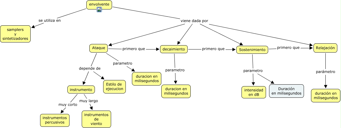 This Concept Map, created with IHMC CmapTools, has information related to: MAPA B MUSICA_ENVOLVENTE, instrumento muy largo instrumentos de viento, Sostenimiento primero que Relajación, Sostenimiento parametro intensidad en dB, envolvente viene dada por decaimiento, decaimiento primero que Sostenimiento, envolvente viene dada por Ataque, Relajación parámetro duración en milisegundos, Ataque primero que decaimiento, envolvente se utiliza en samplers y sintetizadores, envolvente viene dada por Relajación, instrumento muy corto instrumentos percusivos, Ataque depende de Estilo de ejecucion, Sostenimiento parametro Duración en milisegundos, Ataque depende de instrumento, decaimiento parametro duracion en milisegundos, Ataque parametro duracion en milisegundos, envolvente viene dada por Sostenimiento
