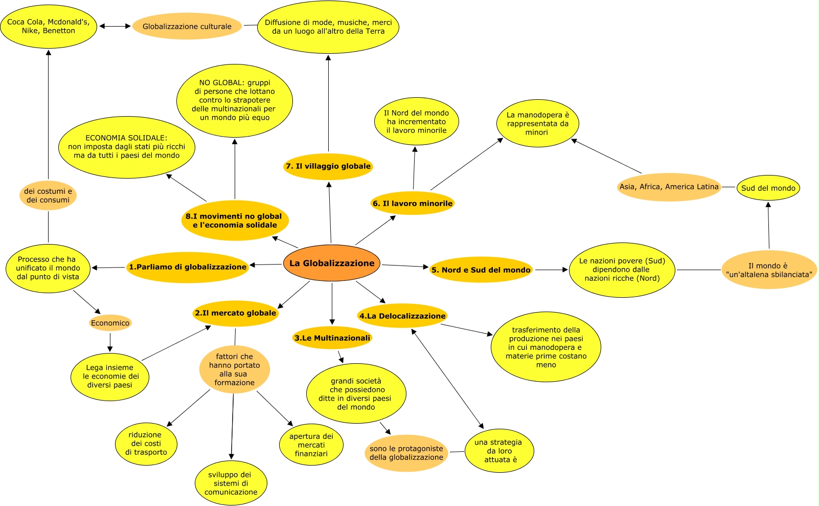 This Concept Map, created with IHMC CmapTools, has information related to: Mappa concettuale sulla globalizzazione, La Globalizzazione 3.Le Multinazionali grandi società che possiedono ditte in diversi paesi del mondo, La Globalizzazione 8.I movimenti no global e l'economia solidale ECONOMIA SOLIDALE: non imposta dagli stati più ricchi ma da tutti i paesi del mondo, La Globalizzazione 2.Il mercato globale sviluppo dei sistemi di comunicazione, Lega insieme le economie dei diversi paesi 2.Il mercato globale sviluppo dei sistemi di comunicazione, Processo che ha unificato il mondo dal punto di vista Economico Lega insieme le economie dei diversi paesi, La Globalizzazione 4.La Delocalizzazione trasferimento della produzione nei paesi in cui manodopera e materie prime costano meno, sviluppo dei sistemi di comunicazione fattori che hanno portato alla sua formazione riduzione dei costi di trasporto, Sud del mondo Asia, Africa, America Latina La manodopera è rappresentata da minori, La Globalizzazione 6. Il lavoro minorile La manodopera è rappresentata da minori, La Globalizzazione 5. Nord e Sud del mondo Le nazioni povere (Sud) dipendono dalle nazioni ricche (Nord), Coca Cola, Mcdonald's, Nike, Benetton Globalizzazione culturale ????, La Globalizzazione 1.Parliamo di globalizzazione Processo che ha unificato il mondo dal punto di vista, La Globalizzazione 8.I movimenti no global e l'economia solidale NO GLOBAL: gruppi di persone che lottano contro lo strapotere delle multinazionali per un mondo più equo, una strategia da loro attuata è 4.La Delocalizzazione trasferimento della produzione nei paesi in cui manodopera e materie prime costano meno, La Globalizzazione 6. Il lavoro minorile Il Nord del mondo ha incrementato il lavoro minorile, sviluppo dei sistemi di comunicazione fattori che hanno portato alla sua formazione apertura dei mercati finanziari, grandi società che possiedono ditte in diversi paesi del mondo sono le protagoniste della globalizzazione una strategia da loro attuata è, Le nazioni povere (Sud) dipendono dalle nazioni ricche (Nord) Il mondo è "un'altalena sbilanciata" Sud del mondo, Processo che ha unificato il mondo dal punto di vista dei costumi e dei consumi Coca Cola, Mcdonald's, Nike, Benetton, La Globalizzazione 7. Il villaggio globale Diffusione di mode, musiche, merci da un luogo all'altro della Terra