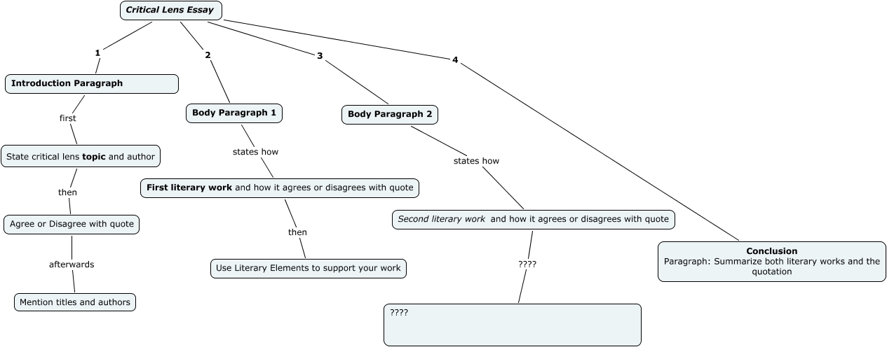 critical lens, Critical Lens Essay 2 Body Paragraph 1, Critical Lens Essay 3 Body Paragraph 2, Introduction Paragraph first State critical lens topic and author, Critical Lens Essay 4 Conclusion Paragraph: Summarize both literary works and the quotation, Body Paragraph 2 states how Second literary work and how it agrees or disagrees with quote, Body Paragraph 1 states how First literary work and how it agrees or disagrees with quote, State critical lens topic and author then Agree or Disagree with quote, Critical Lens Essay 1 Introduction Paragraph, Agree or Disagree with quote afterwards Mention titles and authors, Second literary work and how it agrees or disagrees with quote ???? ????