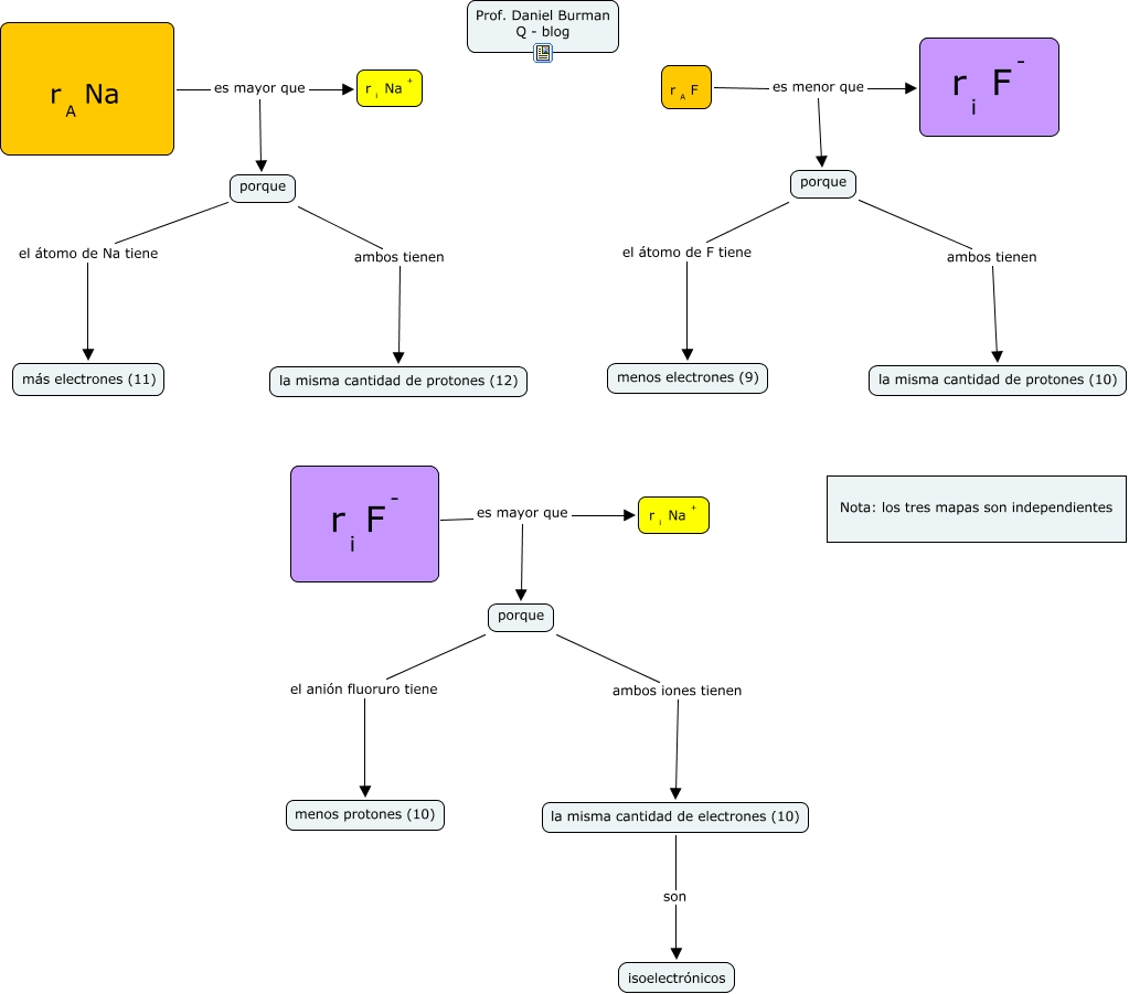 This Concept Map, created with IHMC CmapTools, has information related to: Radios iónicos, <math xmlns="http://www.w3.org/1998/Math/MathML"> <mrow> <mtext> r </mtext> <mmultiscripts> <mtext> </mtext> <mtext> A </mtext> <none/> </mmultiscripts> <mtext> Na </mtext> <mmultiscripts> <mtext> </mtext> <none/> <mtext> </mtext> </mmultiscripts> </mrow> </math> es mayor que <math xmlns="http://www.w3.org/1998/Math/MathML"> <mrow> <mtext> r </mtext> <mmultiscripts> <mtext> </mtext> <mtext> i </mtext> <none/> </mmultiscripts> <mtext> Na </mtext> <mmultiscripts> <mtext> </mtext> <none/> <mtext> + </mtext> </mmultiscripts> </mrow> </math>, porque el átomo de Na tiene más electrones (11), <math xmlns="http://www.w3.org/1998/Math/MathML"> <mrow> <mtext> r </mtext> <mmultiscripts> <mtext> </mtext> <mtext> i </mtext> <none/> </mmultiscripts> <mtext> F </mtext> <mmultiscripts> <mtext> </mtext> <none/> <mtext> - </mtext> </mmultiscripts> </mrow> </math> es mayor que porque, porque ambos tienen la misma cantidad de protones (10), la misma cantidad de electrones (10) son isoelectrónicos, porque el anión fluoruro tiene menos protones (10), <math xmlns="http://www.w3.org/1998/Math/MathML"> <mrow> <mtext> r </mtext> <mmultiscripts> <mtext> </mtext> <mtext> i </mtext> <none/> </mmultiscripts> <mtext> F </mtext> <mmultiscripts> <mtext> </mtext> <none/> <mtext> - </mtext> </mmultiscripts> </mrow> </math> es mayor que <math xmlns="http://www.w3.org/1998/Math/MathML"> <mrow> <mtext> r </mtext> <mmultiscripts> <mtext> </mtext> <mtext> i </mtext> <none/> </mmultiscripts> <mtext> Na </mtext> <mmultiscripts> <mtext> </mtext> <none/> <mtext> + </mtext> </mmultiscripts> </mrow> </math>, <math xmlns="http://www.w3.org/1998/Math/MathML"> <mrow> <mtext> r </mtext> <mmultiscripts> <mtext> </mtext> <mtext> A </mtext> <none/> </mmultiscripts> <mtext> F </mtext> <mmultiscripts> <mtext> </mtext> <none/> <mtext> </mtext> </mmultiscripts> </mrow> </math> es menor que porque, <math xmlns="http://www.w3.org/1998/Math/MathML"> <mrow> <mtext> r </mtext> <mmultiscripts> <mtext> </mtext> <mtext> A </mtext> <none/> </mmultiscripts> <mtext> F </mtext> <mmultiscripts> <mtext> </mtext> <none/> <mtext> </mtext> </mmultiscripts> </mrow> </math> es menor que <math xmlns="http://www.w3.org/1998/Math/MathML"> <mrow> <mtext> r </mtext> <mmultiscripts> <mtext> </mtext> <mtext> i </mtext> <none/> </mmultiscripts> <mtext> F </mtext> <mmultiscripts> <mtext> </mtext> <none/> <mtext> - </mtext> </mmultiscripts> </mrow> </math>, porque el átomo de F tiene menos electrones (9), porque ambos iones tienen la misma cantidad de electrones (10), <math xmlns="http://www.w3.org/1998/Math/MathML"> <mrow> <mtext> r </mtext> <mmultiscripts> <mtext> </mtext> <mtext> A </mtext> <none/> </mmultiscripts> <mtext> Na </mtext> <mmultiscripts> <mtext> </mtext> <none/> <mtext> </mtext> </mmultiscripts> </mrow> </math> es mayor que porque, porque ambos tienen la misma cantidad de protones (12)