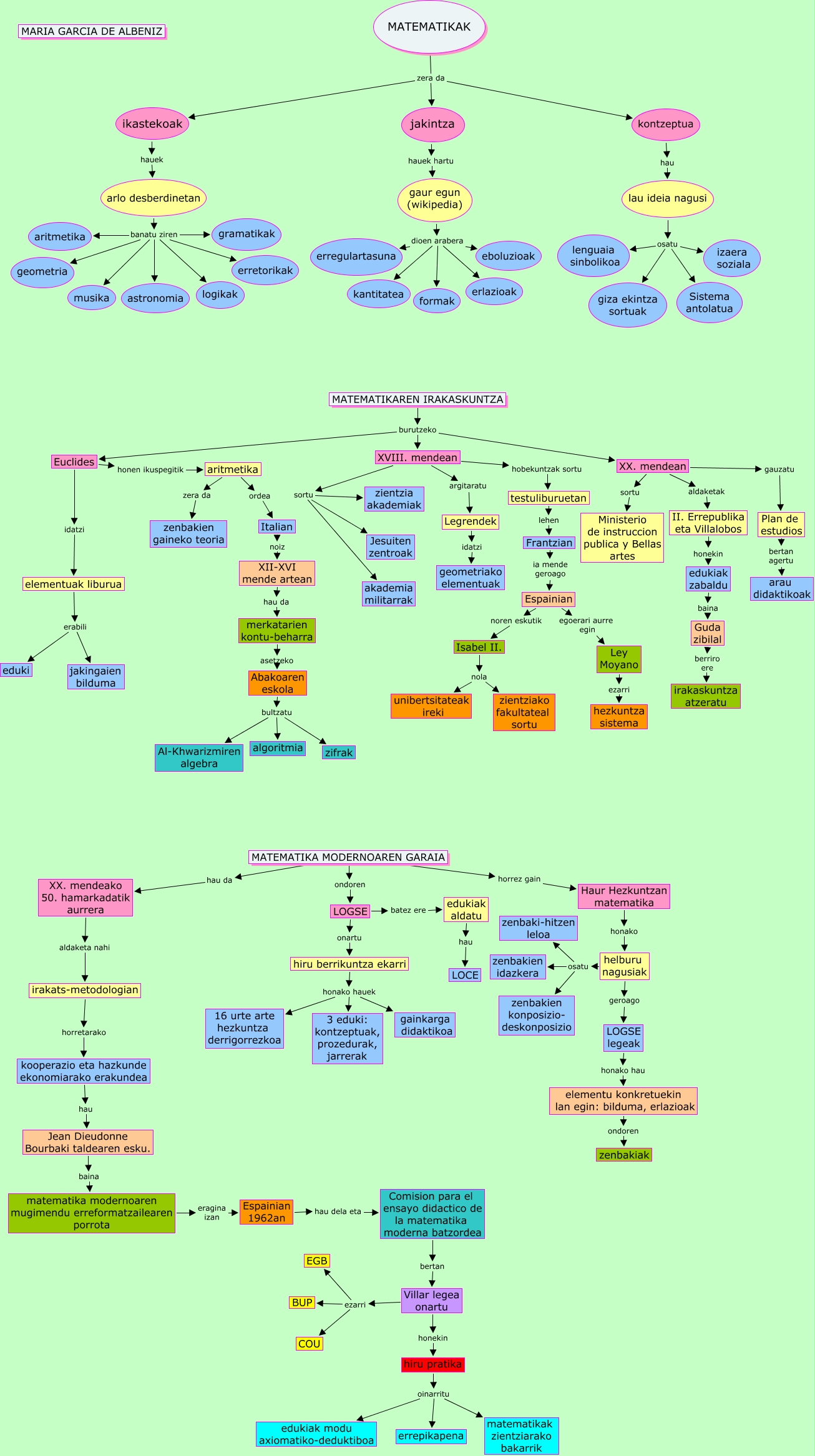 This Concept Map, created with IHMC CmapTools, has information related to: 1_mapa_Garcia de Albeniz_Goikoetxea, MATEMATIKAREN IRAKASKUNTZA burutzeko Euclides, arlo desberdinetan banatu ziren erretorikak, gaur egun (wikipedia) dioen arabera erregulartasuna, XVIII. mendean sortu akademia militarrak, Abakoaren eskola bultzatu zifrak, LOGSE legeak honako hau elementu konkretuekin lan egin: bilduma, erlazioak, Comision para el ensayo didactico de la matematika moderna batzordea bertan Villar legea onartu, lau ideia nagusi osatu Sistema antolatua, Abakoaren eskola bultzatu algoritmia, MATEMATIKAK zera da kontzeptua, Isabel II. nola unibertsitateak ireki, elementuak liburua erabili jakingaien bilduma, merkatarien kontu-beharra asetzeko Abakoaren eskola, MATEMATIKAREN IRAKASKUNTZA burutzeko XX. mendean, Villar legea onartu ezarri BUP, arlo desberdinetan banatu ziren geometria, gaur egun (wikipedia) dioen arabera formak, XII-XVI mende artean hau da merkatarien kontu-beharra, kontzeptua hau lau ideia nagusi, Jean Dieudonne Bourbaki taldearen esku. baina matematika modernoaren mugimendu erreformatzailearen porrota