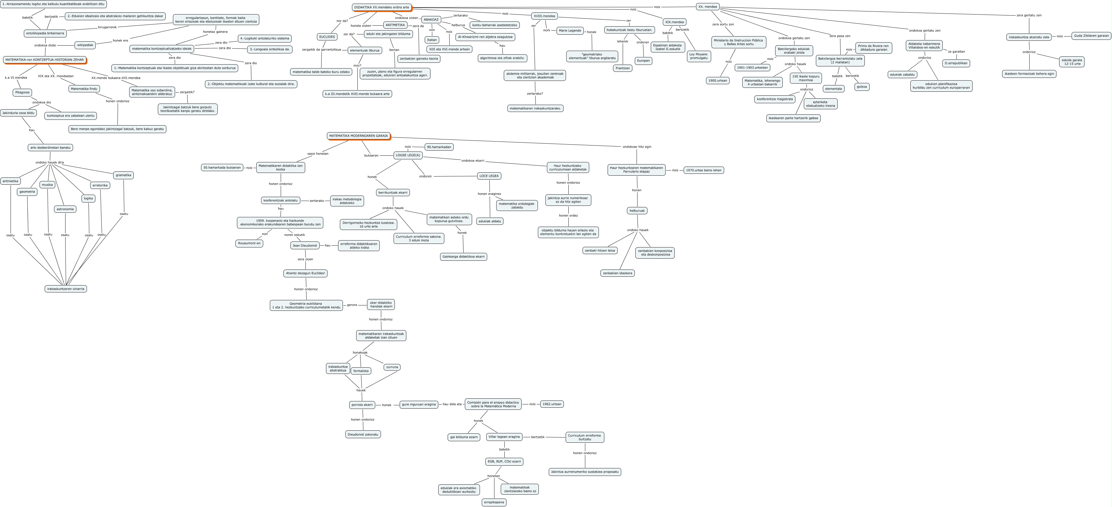This Concept Map, created with IHMC CmapTools, has information related to: 1_mapa_ortega_arraztoa, ABAKOAZ non Italian, Comisión para el ensayo didactico sobre la Matemática Moderna honek gai bilduma ezarri, XX. mendea ondokoa gertatu zen Aldaketa nabarmena Villalobos-en eskutik, XX. mendea zera pasa zen Batxilergoa berrantolatu zela (2 mailatan), XX. mendea ondokoa gertatu zen Batxilergoko edukiak erabaki zirela, entziklopedia britainiarra bertzetik 2.-Edukien idealizaio eta abstrakzio mailaren gehikuntza dakar, DIDAKTIKA XX.mendeko erdira arte honela zioten ARITMETIKA, irakaskuntza atzeratu zela ondorioz eskola garaia 12-15 urte, matematikan asteko ordu kopurua gutxitzea. honek Gainkarga didaktikoa ekarri, Jean Dieudonné zera zioen Ahantz dezagun Euclides!, Matematikaren didaktika zen kezka honen ondorioz konferentziak antolatu, logika osatu irakaskuntzaren oinarria, EGB, BUP, COU ezarri honetan edukiak era axiomatiko deduktiboan aurkeztu, XIX.mendea batetik Espainian aldaketa Isabel II.eskutik, irakaskuntza atzeratu zela ondorioz ikasleen formazioak behera egin, Ministerio de Instruccion Pública y Bellas Artes sortu noiz 1900.urtean, 1959. kooperazio eta hazkunde ekonomikorako erakundearen babespean burutu zen noren eskutik Jean Dieudonné, matematikaren irakaskuntzak aldaketak izan zituen honakoak irakaskuntza abstraktua, astronomia osatu irakaskuntzaren oinarria, XX. mendea zera sortu zen Ministerio de Instruccion Pública y Bellas Artes sortu
