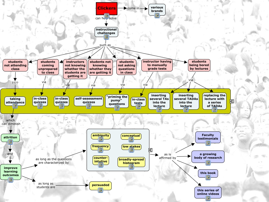 This Concept Map, created with IHMC CmapTools, has information related to: clickers, ???? as is affirmed by a growing body of research, students being bored by lectures via replacing the lecture with a series of TADAs, Clickers can help solve instructional challenges, improve learning outcomes as long as the questions are characterized by ????, instructional challenges such as students not asking questions in class, students being bored by lectures via inserting several TAs into the lecture, students not attending class ???? taking attendance, instructional challenges such as instructor having to manually grade tests, ???? as is affirmed by this book, instructional challenges such as students being bored by lectures, instructors not knowing whether the students are getting it via in-class quizzes, instructional challenges such as students not attending class, taking attendance which can diminish attrition, Clickers come in various brands, ???? as is affirmed by Faculty testimonials, instructor having to manually grade tests via in-class tests, instructional challenges such as students not knowing whether they are getting it, students being bored by lectures via inserting several TADAs into the lecture, improve learning outcomes as long as students are persuaded, students not asking questions in class via "priming the pump" questions