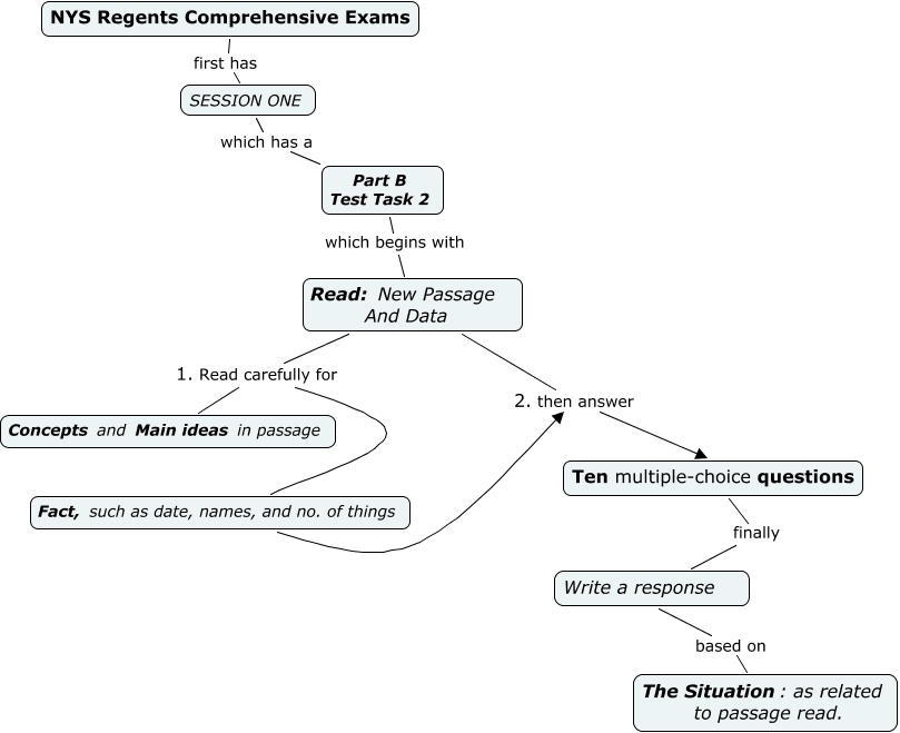 This Concept Map, created with IHMC CmapTools, has information related to: NYS Regents Comprehensive Exams-session one-part b, Write a response based on The Situation: as related to passage read., Fact, such as date, names, and no. of things 2. then answer Ten multiple-choice questions, Part B Test Task 2 which begins with Read: New Passage And Data, NYS Regents Comprehensive Exams first has SESSION ONE, Ten multiple-choice questions finally Write a response, Read: New Passage And Data 2. then answer Ten multiple-choice questions, Read: New Passage And Data 1. Read carefully for Fact, such as date, names, and no. of things, Read: New Passage And Data 1. Read carefully for Concepts and Main ideas in passage, SESSION ONE which has a Part B Test Task 2