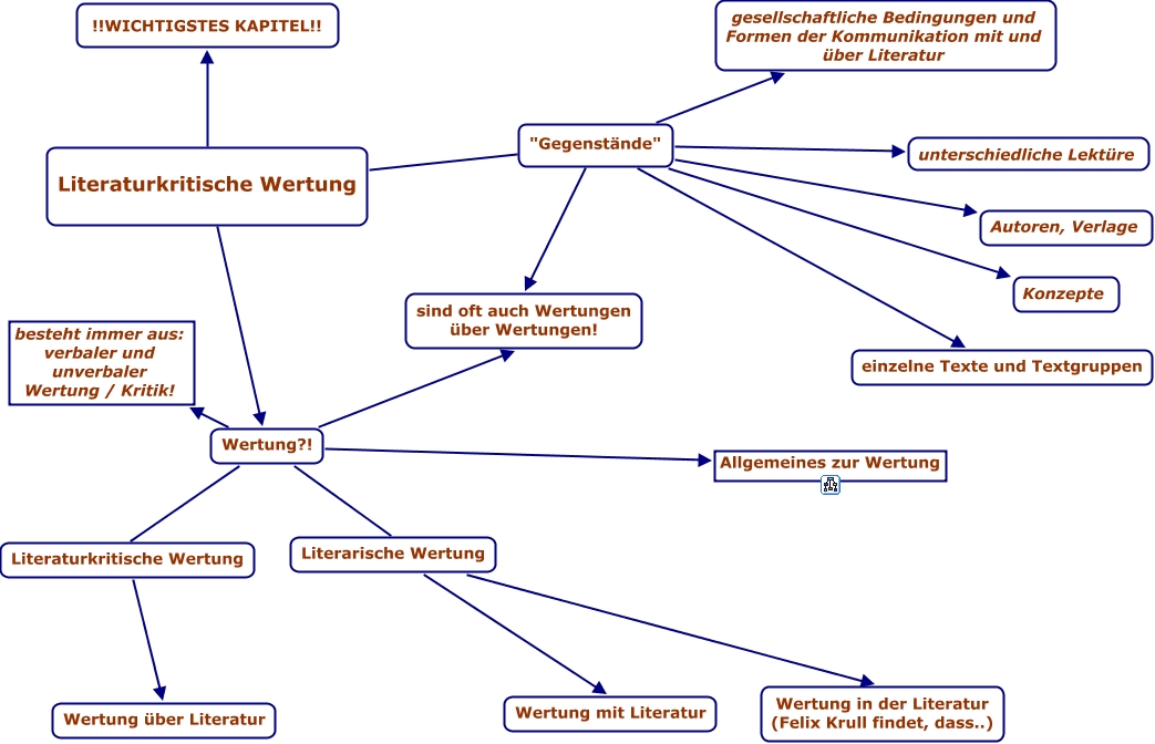 This Concept Map, created with IHMC CmapTools, has information related to: Literaturkritische Wertung, Literaturkritische Wertung !!WICHTIGSTES KAPITEL!!, Wertung?! besteht immer aus: verbaler und unverbaler Wertung / Kritik!, Literaturkritische Wertung "Gegenstände" Konzepte, Wertung?! Literaturkritische Wertung, Wertung?! Allgemeines zur Wertung, Literaturkritische Wertung "Gegenstände" einzelne Texte und Textgruppen, Literarische Wertung Wertung in der Literatur (Felix Krull findet, dass..), Literaturkritische Wertung Wertung über Literatur, Literaturkritische Wertung Wertung?!, Literaturkritische Wertung "Gegenstände" gesellschaftliche Bedingungen und Formen der Kommunikation mit und über Literatur, Literarische Wertung Wertung mit Literatur, Wertung?! sind oft auch Wertungen über Wertungen!, Literaturkritische Wertung "Gegenstände" Autoren, Verlage, Wertung?! Literarische Wertung, Literaturkritische Wertung "Gegenstände" sind oft auch Wertungen über Wertungen!, Literaturkritische Wertung "Gegenstände" unterschiedliche Lektüre