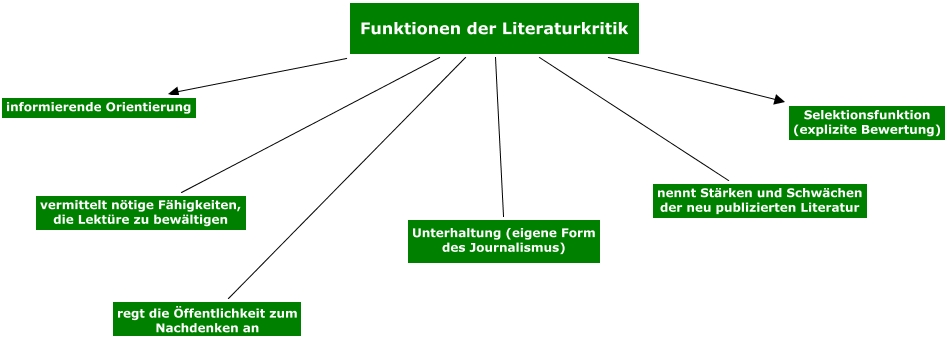 This Concept Map, created with IHMC CmapTools, has information related to: Funktionen, Funktionen der Literaturkritik vermittelt nötige Fähigkeiten, die Lektüre zu bewältigen, Funktionen der Literaturkritik nennt Stärken und Schwächen der neu publizierten Literatur, Funktionen der Literaturkritik Selektionsfunktion (explizite Bewertung), Funktionen der Literaturkritik Unterhaltung (eigene Form des Journalismus), Funktionen der Literaturkritik regt die Öffentlichkeit zum Nachdenken an, Funktionen der Literaturkritik informierende Orientierung