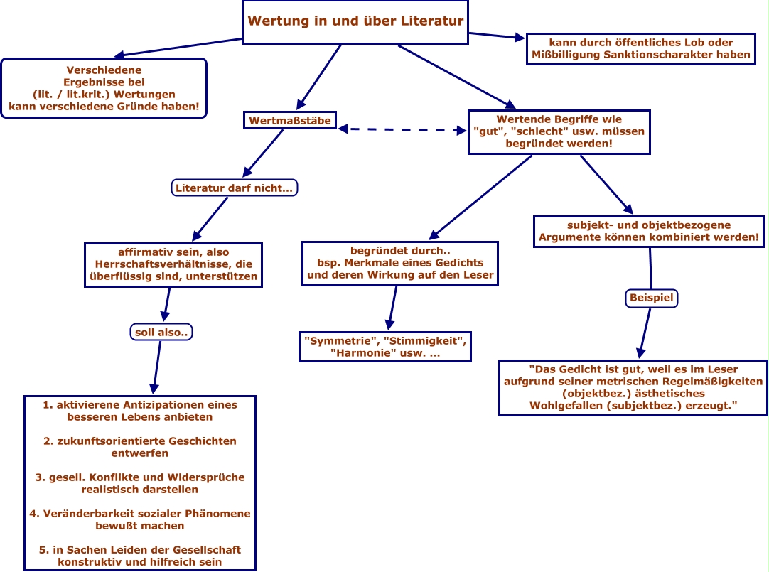 This Concept Map, created with IHMC CmapTools, has information related to: Literaturkritische Wertung (allgemeine Infos), Wertende Begriffe wie "gut", "schlecht" usw. müssen begründet werden! subjekt- und objektbezogene Argumente können kombiniert werden!, subjekt- und objektbezogene Argumente können kombiniert werden! Beispiel "Das Gedicht ist gut, weil es im Leser aufgrund seiner metrischen Regelmäßigkeiten (objektbez.) ästhetisches Wohlgefallen (subjektbez.) erzeugt.", Wertende Begriffe wie "gut", "schlecht" usw. müssen begründet werden! begründet durch.. bsp. Merkmale eines Gedichts und deren Wirkung auf den Leser, begründet durch.. bsp. Merkmale eines Gedichts und deren Wirkung auf den Leser "Symmetrie", "Stimmigkeit", "Harmonie" usw. ..., Wertende Begriffe wie "gut", "schlecht" usw. müssen begründet werden! Wertmaßstäbe, Wertung in und über Literatur Wertmaßstäbe, affirmativ sein, also Herrschaftsverhältnisse, die überflüssig sind, unterstützen soll also.. 1. aktivierene Antizipationen eines besseren Lebens anbieten 2. zukunftsorientierte Geschichten entwerfen 3. gesell. Konflikte und Widersprüche realistisch darstellen 4. Veränderbarkeit sozialer Phänomene bewußt machen 5. in Sachen Leiden der Gesellschaft konstruktiv und hilfreich sein, Wertung in und über Literatur Verschiedene Ergebnisse bei (lit. / lit.krit.) Wertungen kann verschiedene Gründe haben!, Wertung in und über Literatur kann durch öffentliches Lob oder Mißbilligung Sanktionscharakter haben, Wertung in und über Literatur Wertende Begriffe wie "gut", "schlecht" usw. müssen begründet werden!, Wertmaßstäbe Literatur darf nicht... affirmativ sein, also Herrschaftsverhältnisse, die überflüssig sind, unterstützen