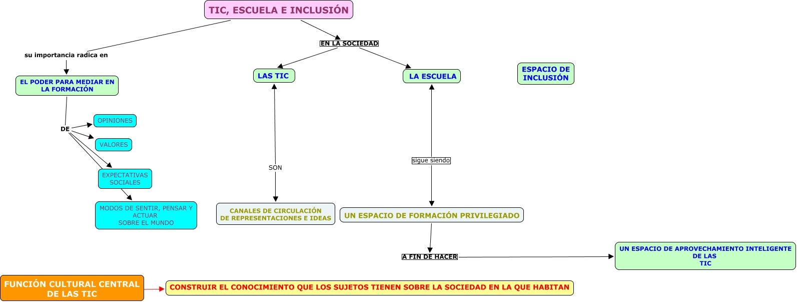 This Concept Map, created with IHMC CmapTools, has information related to: TIC ESCUELA E INCLUSION, TIC, ESCUELA E INCLUSIÓN su importancia radica en EL PODER PARA MEDIAR EN LA FORMACIÓN, EL PODER PARA MEDIAR EN LA FORMACIÓN DE MODOS DE SENTIR, PENSAR Y ACTUAR SOBRE EL MUNDO, FUNCIÓN CULTURAL CENTRAL DE LAS TIC ???? CONSTRUIR EL CONOCIMIENTO QUE LOS SUJETOS TIENEN SOBRE LA SOCIEDAD EN LA QUE HABITAN, TIC, ESCUELA E INCLUSIÓN EN LA SOCIEDAD LA ESCUELA, EL PODER PARA MEDIAR EN LA FORMACIÓN DE OPINIONES, UN ESPACIO DE FORMACIÓN PRIVILEGIADO A FIN DE HACER UN ESPACIO DE APROVECHAMIENTO INTELIGENTE DE LAS TIC, EL PODER PARA MEDIAR EN LA FORMACIÓN DE EXPECTATIVAS SOCIALES, TIC, ESCUELA E INCLUSIÓN EN LA SOCIEDAD LAS TIC, EL PODER PARA MEDIAR EN LA FORMACIÓN DE VALORES