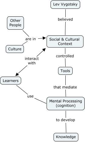 This Concept Map, created with IHMC CmapTools, has information related to: Lev Vygotsky's Learning Theory, Social & Cultural Context controlled Tools, Lev Vygotsky believed Social & Cultural Context, Mental Processing (cognition) to develop Knowledge, Culture are in Social & Cultural Context, Learners use Mental Processing (cognition), Tools that mediate Mental Processing (cognition), Other People are in Social & Cultural Context
