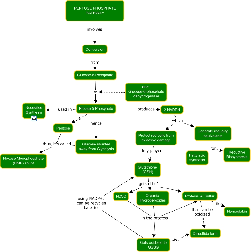 This Concept Map, created with IHMC CmapTools, has information related to: 19. Pentose Phosphate Pathway, H2O2 in the process Gets oxidized to GSSG, Glutathione (GSH) gets rid of Organic Hydroperoxides, Generate reducing equivelants for Reductive Biosynthesis, 2 NADPH which Protect red cells from oxidative damage, Organic Hydroperoxides in the process Proteins w/ Sulfur, H2O2 in the process Proteins w/ Sulfur, Glutathione (GSH) gets rid of Proteins w/ Sulfur, Ribose-5-Phosphate a Pentose, enz: Glucose-6-phosphate dehydrogenase to Ribose-5-Phosphate, Organic Hydroperoxides in the process Gets oxidized to GSSG, Generate reducing equivelants for Fatty acid synthesis, Ribose-5-Phosphate used in Nuceotide Synthesis, PENTOSE PHOSPHATE PATHWAY involves Conversion, Glucose shunted away from Glycolysis thus, it's called Hexose Monophosphate (HMP) shunt, 2 NADPH which Generate reducing equivelants, Gets oxidized to GSSG ie, Dissulfide form, enz: Glucose-6-phosphate dehydrogenase produces 2 NADPH, Ribose-5-Phosphate hence Glucose shunted away from Glycolysis, Conversion from Glucose-6-Phosphate, Glutathione (GSH) gets rid of H2O2