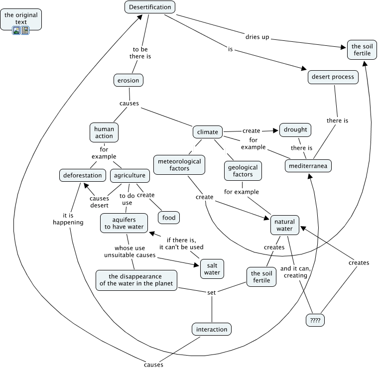 This Concept Map has information related to: Desertification, natural water and it can, creating ????, agriculture to do use aquifers to have water, natural water creates the soil fertile, salt water if there is, it can't be used aquifers to have water, Desertification to be there is erosion, climate geological factors, Desertification is desert process, human action for example agriculture, climate for example mediterranea, drought there is mediterranea