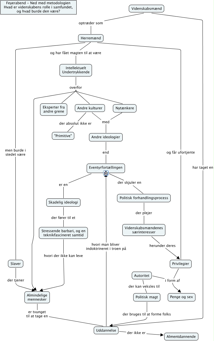 This Concept Map has information related to: Feyerabend - Ned med metodologien_videnskabogsamfund, Almindelige mennesker er tvunget til at tage en Uddannelse, Autoritet der kan veksles til Politisk magt, Nytænkere med Andre ideologier, Videnskabsmænd har taget en Uddannelse, Andre kulturer der absolut ikke er "Primitive", Politisk forhandlingsprocess der plejer Videnskabsmændenes særinteresser, Intellektuelt Undertrykkende overfor Eksperter fra andre grene, Privilegier i form af Penge og sex, Herremænd men burde i stedet være Slaver, Stressende barbari, og en teknikfascineret samtid hvori der ikke kan leve Almindelige mennesker
