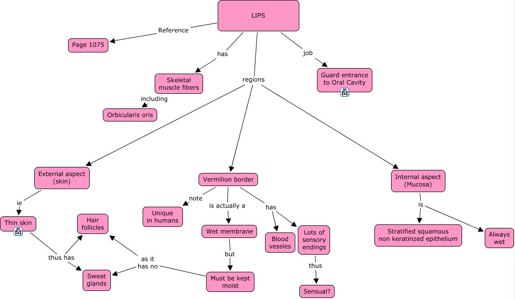 This Concept Map has information related to: 15a. Lips, Vermilion border has Blood vessles, LIPS regions External aspect (skin), Thin skin thus has Hair follicles, Internal aspect (Mucosa) is Stratified squamous non keratinzed epithelium, Lots of sensory endings thus Sensual?, LIPS has Skeletal muscle fibers, Vermilion border note Unique in humans, Thin skin thus has Sweat glands, Skeletal muscle fibers including Orbicularis oris, Must be kept moist as it has no Sweat glands
