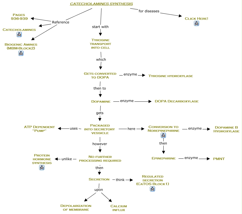 This Concept Map has information related to: 13a. Catecholamine Synthesis, Secretion upon Depolarization of membrane, CATECHOLAMINES SYNTHESIS for diseases Click Here!, Secretion think Regulated secretion (CaTOS Block1), Epinephrine enzyme PMNT, Dopamine enzyme DOPA Decarboxylase, Packaged into secretory vessicle here Conversion to Norepinephrine, No further processing required then Secretion, Tyrosine transport into cell which Gets converted to DOPA, CATECHOLAMINES SYNTHESIS Reference Catecholamines, CATECHOLAMINES SYNTHESIS start with Tyrosine transport into cell
