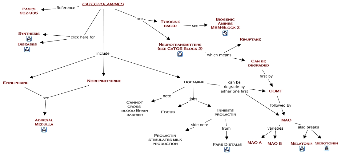 This Concept Map has information related to: 13. Catecholamines, CATECHOLAMINES include Norepinephrine, MAO also breaks Melatonin, Dopamine can be degrade by either one first COMT, MAO also breaks Serotonin, Norepinephrine see Adrenal Medulla, CATECHOLAMINES click here for Synthesis, Neurotransmitters (see CaTOS Block 2) which means Re-uptake, Dopamine jobs Inhibits prolactin, Dopamine can be degrade by either one first MAO, Neurotransmitters (see CaTOS Block 2) which means Can be degraded