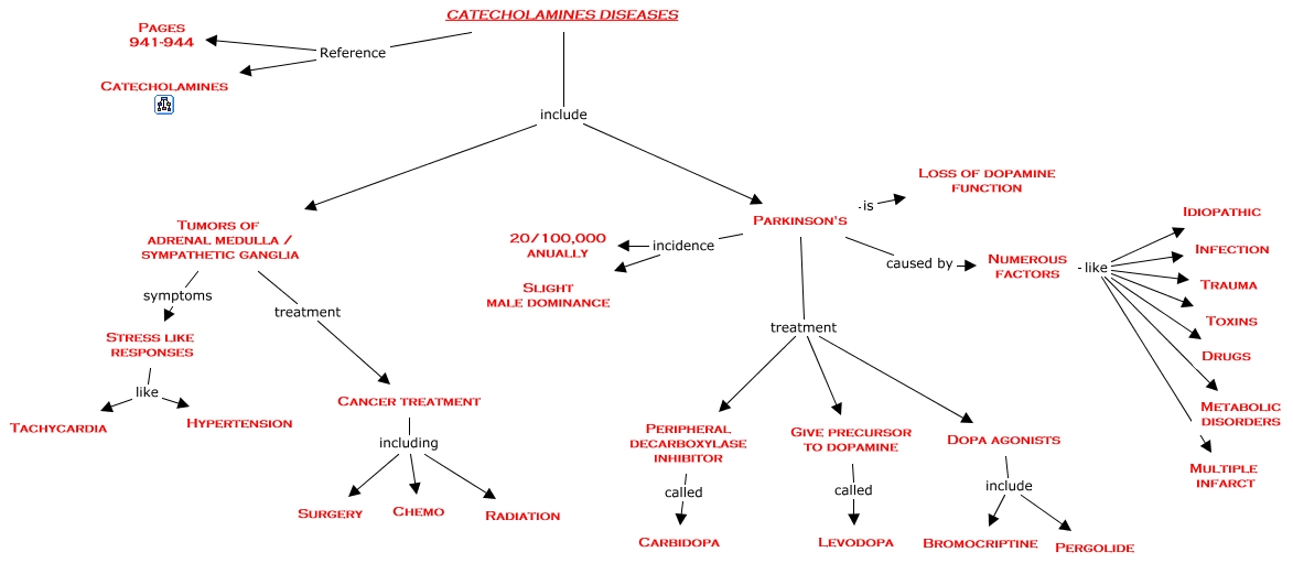 This Concept Map has information related to: 13b. Catecholamine Diseases, Dopa agonists include Pergolide, Parkinson's caused by Numerous factors, Stress like responses like Tachycardia, CATECHOLAMINES DISEASES include Parkinson's, Numerous factors like Toxins, Numerous factors like Idiopathic, Parkinson's treatment Peripheral decarboxylase inhibitor, Tumors of adrenal medulla / sympathetic ganglia symptoms Stress like responses, CATECHOLAMINES DISEASES Reference Catecholamines, Cancer treatment including Chemo