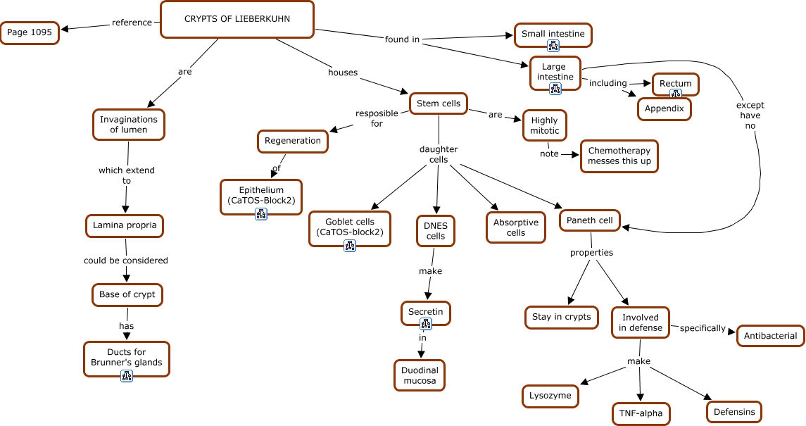 This Concept Map has information related to: 18a. Crypts of Lieberkuhn, CRYPTS OF LIEBERKUHN reference Page 1095, Regeneration of Epithelium (CaTOS-Block2), Stem cells daughter cells Absorptive cells, Base of crypt has Ducts for Brunner's glands, Highly mitotic note Chemotherapy messes this up, Stem cells daughter cells Goblet cells (CaTOS-block2), DNES cells make Secretin, Paneth cell properties Involved in defense, Involved in defense make Defensins, Involved in defense specifically Antibacterial