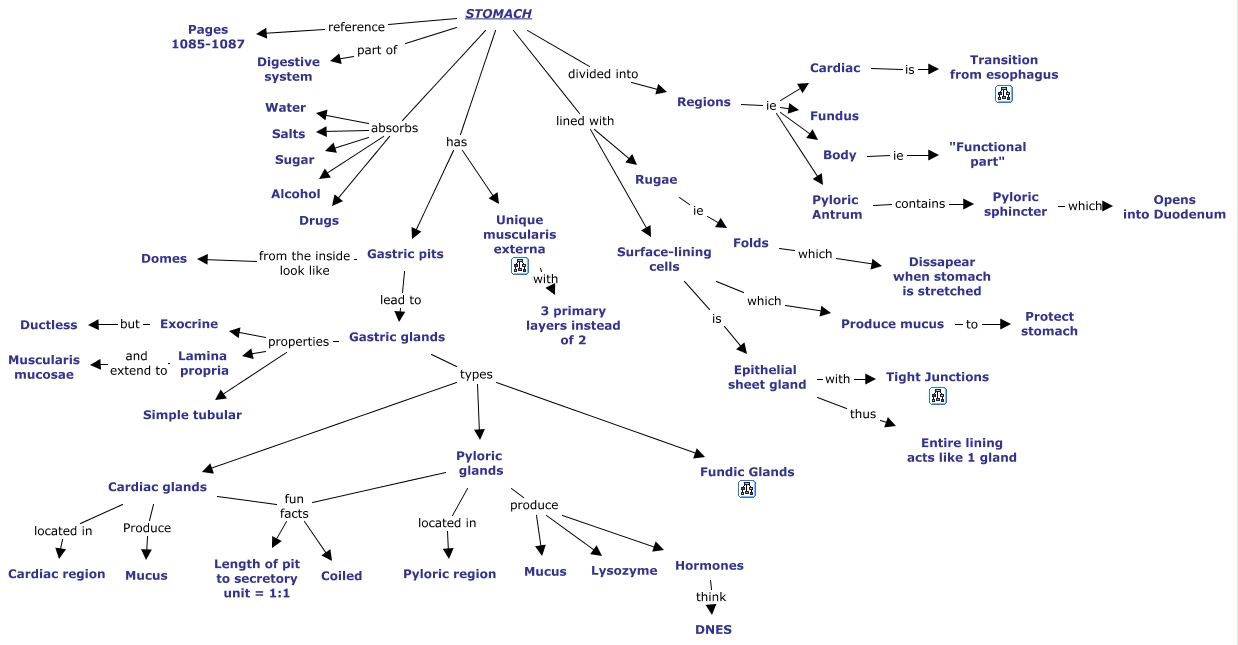 This Concept Map has information related to: 17. Stomach, Cardiac glands located in Cardiac region, Surface-lining cells is Epithelial sheet gland, Surface-lining cells which Produce mucus, Pyloric glands fun facts Coiled, Gastric glands types Fundic Glands, STOMACH absorbs Salts, Hormones think DNES, Gastric glands types Cardiac glands, Pyloric glands produce Mucus, Pyloric glands produce Lysozyme