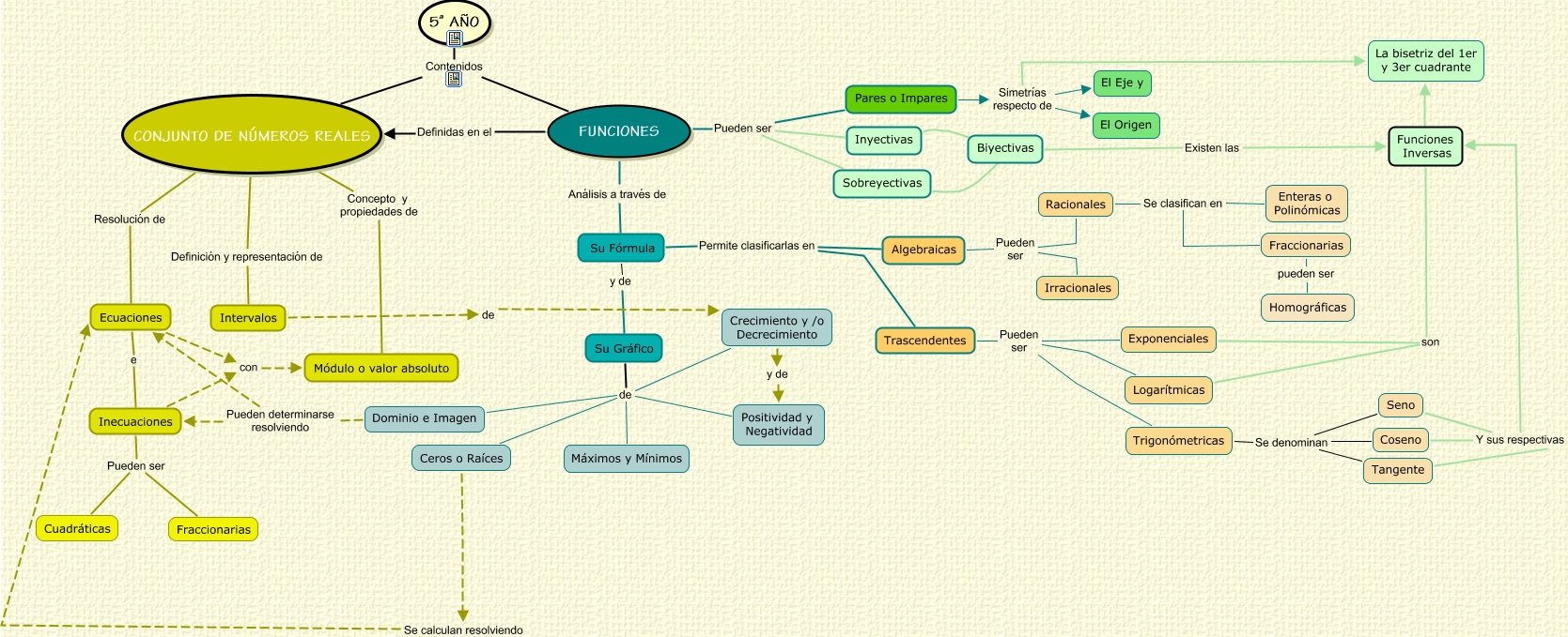Este mapa conceptual tiene información relacionada a: Contenidos 5º, Su Gráfico de Ceros o Raíces, Biyectivas Existen las Funciones Inversas, Su Gráfico de Positividad y Negatividad, Algebraicas Pueden ser Racionales, Seno Y sus respectivas Funciones Inversas, Dominio e Imagen Pueden determinarse resolviendo Ecuaciones, Ecuaciones con Módulo o valor absoluto, Trigonómetricas Se denominan Coseno, Logarítmicas son Funciones Inversas, Su Fórmula Permite clasificarlas en Algebraicas