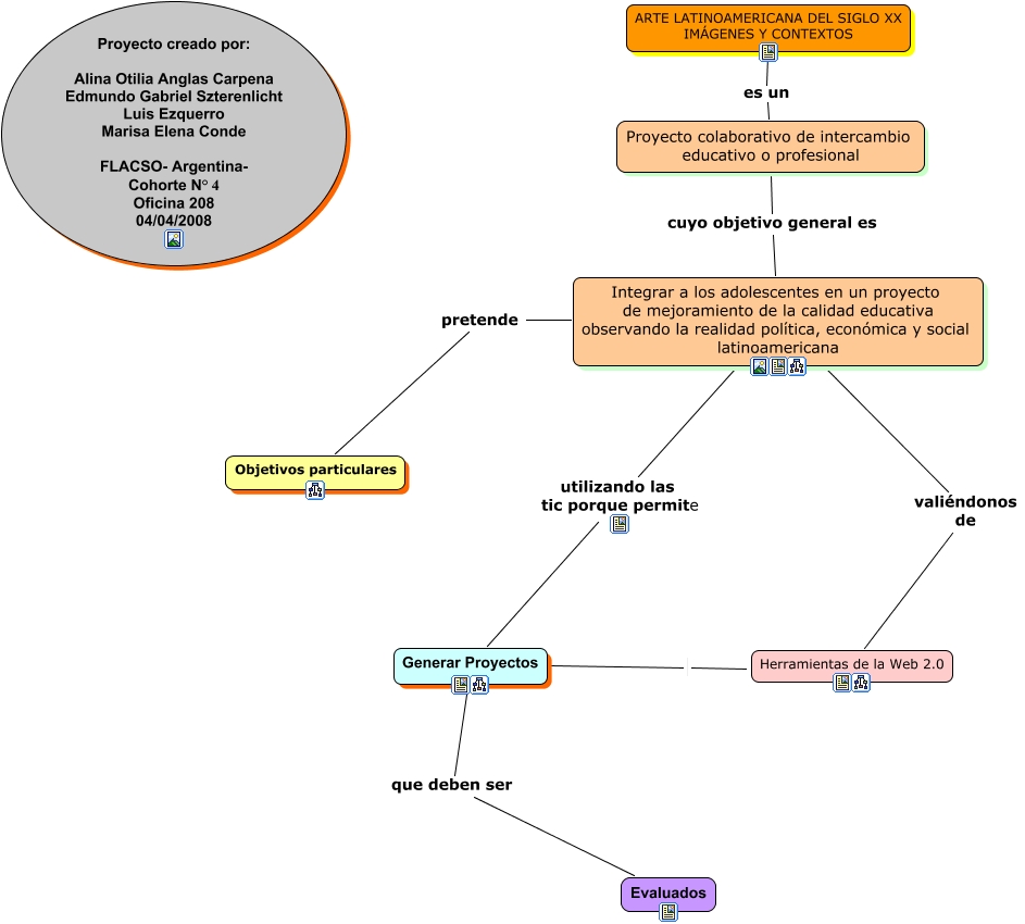 Este Cmap, tiene información relacionada con: Coloquio FLACSO, Integrar a los adolescentes en un proyecto de mejoramiento de la calidad educativa observando la realidad política, económica y social latinoamericana utilizando las tic porque permite Generar Proyectos, ARTE LATINOAMERICANA DEL SIGLO XX IMÁGENES Y CONTEXTOS es un Proyecto colaborativo de intercambio educativo o profesional, Generar Proyectos, Integrar a los adolescentes en un proyecto de mejoramiento de la calidad educativa observando la realidad política, económica y social latinoamericana valiéndonos de Herramientas de la Web 2.0, Proyecto colaborativo de intercambio educativo o profesional cuyo objetivo general es Integrar a los adolescentes en un proyecto de mejoramiento de la calidad educativa observando la realidad política, económica y social latinoamericana, Generar Proyectos que deben ser Evaluados, Integrar a los adolescentes en un proyecto de mejoramiento de la calidad educativa observando la realidad política, económica y social latinoamericana pretende Objetivos particulares