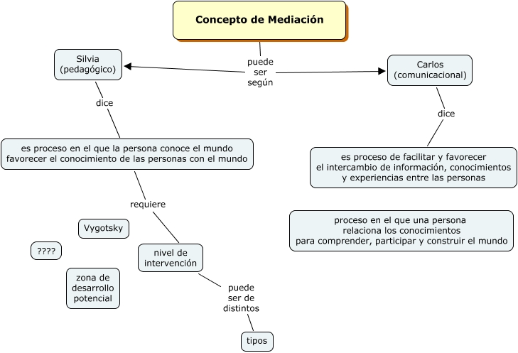 Este mapa conceptual tiene información relacionada a: Concepto de mediacion, es proceso en el que la persona conoce el mundo favorecer el conocimiento de las personas con el mundo requiere nivel de intervención, Carlos (comunicacional) dice es proceso de facilitar y favorecer el intercambio de información, conocimientos y experiencias entre las personas, Concepto de Mediación puede ser según Carlos (comunicacional), Silvia (pedagógico) dice es proceso en el que la persona conoce el mundo favorecer el conocimiento de las personas con el mundo, Concepto de Mediación puede ser según Silvia (pedagógico), nivel de intervención puede ser de distintos tipos