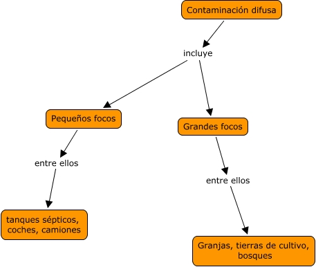 Este mapa conceptual tiene información relacionada a: contaminac difusa, Pequeños focos entre ellos tanques sépticos, coches, camiones, Contaminación difusa incluye Grandes focos, Contaminación difusa incluye Pequeños focos, Grandes focos entre ellos Granjas, tierras de cultivo, bosques