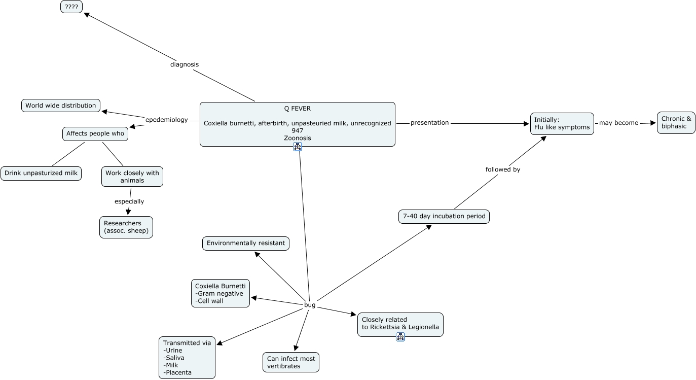 This Concept Map, created with IHMC CmapTools, has information related to: 05f. Q Fever, Q FEVER Coxiella burnetti, afterbirth, unpasteuried milk, unrecognized 947 Zoonosis epedemiology World wide distribution, Q FEVER Coxiella burnetti, afterbirth, unpasteuried milk, unrecognized 947 Zoonosis bug 7-40 day incubation period, Q FEVER Coxiella burnetti, afterbirth, unpasteuried milk, unrecognized 947 Zoonosis epedemiology Affects people who, Affects people who Work closely with animals, Q FEVER Coxiella burnetti, afterbirth, unpasteuried milk, unrecognized 947 Zoonosis bug Coxiella Burnetti -Gram negative -Cell wall, Q FEVER Coxiella burnetti, afterbirth, unpasteuried milk, unrecognized 947 Zoonosis bug Environmentally resistant, Affects people who Drink unpasturized milk, Work closely with animals especially Researchers (assoc. sheep), Q FEVER Coxiella burnetti, afterbirth, unpasteuried milk, unrecognized 947 Zoonosis bug Transmitted via -Urine -Saliva -Milk -Placenta, Q FEVER Coxiella burnetti, afterbirth, unpasteuried milk, unrecognized 947 Zoonosis bug Can infect most vertibrates, Q FEVER Coxiella burnetti, afterbirth, unpasteuried milk, unrecognized 947 Zoonosis presentation Initially: Flu like symptoms, Initially: Flu like symptoms may become Chronic & biphasic, Q FEVER Coxiella burnetti, afterbirth, unpasteuried milk, unrecognized 947 Zoonosis bug Closely related to Rickettsia & Legionella, 7-40 day incubation period followed by Initially: Flu like symptoms, Q FEVER Coxiella burnetti, afterbirth, unpasteuried milk, unrecognized 947 Zoonosis diagnosis ????