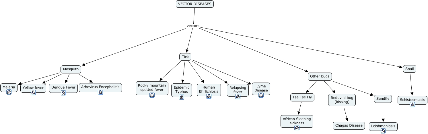This Concept Map, created with IHMC CmapTools, has information related to: 04. Vector Diseases, VECTOR DISEASES vectors Tick, VECTOR DISEASES vectors Snail, VECTOR DISEASES vectors Other bugs, Sandfly Leishmaniasis, Mosquito Arbovirus Encephalitis, Other bugs Sandfly, Mosquito Yellow fever, Tick Rocky mountain spotted fever, Other bugs Reduviid bug (kissing), Reduviid bug (kissing) Chagas Disease, Other bugs Tse Tse Fly, Tick Human Ehrlichiosis, Tick Relapsing fever, VECTOR DISEASES vectors Mosquito, Tse Tse Fly African Sleeping sickness, Tick Lyme Disease, Tick Epidemic Typhus, Mosquito Dengue Fever, Snail Schistosmiasis, Mosquito Malaria