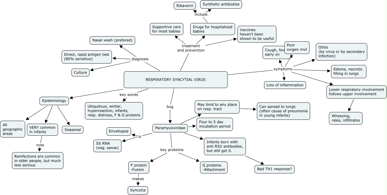 This Concept Map, created with IHMC CmapTools, has information related to: 02b. RSV, Paramyxoviridae key proteiins G proteins -Attachment, RESPIRATORY SYNCYTIAL VIRUS symptoms Cough, fever early on, RESPIRATORY SYNCYTIAL VIRUS treatment and prevention Supportive care for most babies, Paramyxoviridae May bind to any place on resp. tract, VERY common in infants note Reinfections are common in older people, but much less serious, Paramyxoviridae Four to 5 day incubation period, RESPIRATORY SYNCYTIAL VIRUS bug Paramyxoviridae, RESPIRATORY SYNCYTIAL VIRUS key words Ubiquitous, winter, hyperreaction, infants, resp. distress, F & G proteins, Epidemiology VERY common in infants, Paramyxoviridae key proteiins F protein -Fusion, Paramyxoviridae Infants born with anti RSV antibodies, but still get it., Lower respiratory involvement follows upper involvement Wheezing, rales, infiltrates, Drugs for hospitalized babies include Synthetic antibodies, RESPIRATORY SYNCYTIAL VIRUS diagnosis Nasal wash (prefered), RESPIRATORY SYNCYTIAL VIRUS symptoms Lower respiratory involvement follows upper involvement, RESPIRATORY SYNCYTIAL VIRUS symptoms Poor oxigen mvt, RESPIRATORY SYNCYTIAL VIRUS diagnosis Direct, rapid antigen test (80% sensitive), RESPIRATORY SYNCYTIAL VIRUS treatment and prevention Vaccines haven't been shown to be useful, Epidemiology Seasonal, RESPIRATORY SYNCYTIAL VIRUS diagnosis Culture