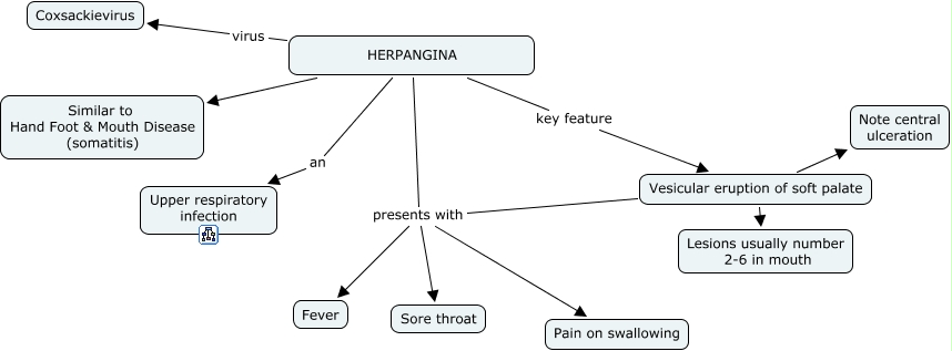 This Concept Map, created with IHMC CmapTools, has information related to: 01b. Herpangina, Vesicular eruption of soft palate presents with Pain on swallowing, Vesicular eruption of soft palate presents with Fever, HERPANGINA presents with Sore throat, Vesicular eruption of soft palate Note central ulceration, HERPANGINA presents with Fever, HERPANGINA key feature Vesicular eruption of soft palate, HERPANGINA an Upper respiratory infection, HERPANGINA Similar to Hand Foot & Mouth Disease (somatitis), Vesicular eruption of soft palate presents with Sore throat, HERPANGINA virus Coxsackievirus, Vesicular eruption of soft palate Lesions usually number 2-6 in mouth, HERPANGINA presents with Pain on swallowing